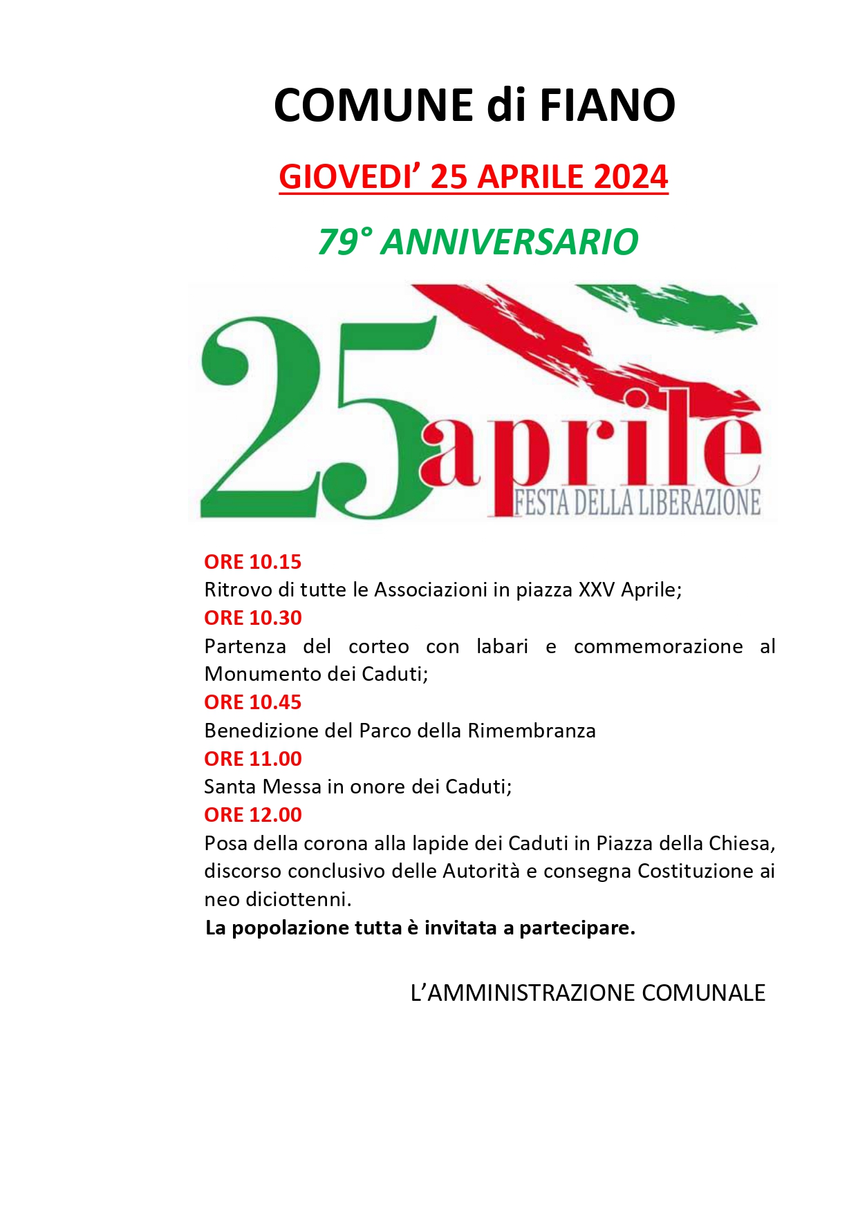 In data 25 aprile 2024, si svolgerà il 79° anniversario della Festa della Liberazione, che per il Comune di Fiano, il cronoprogramma sarà come da manifesto allegato alla presente comunicazione, con ritrovo delle Associazioni in Piazza XXV Aprile, alle ore 10.15.