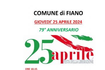 25 aprile 2024 79° Anniversario della Liberazione In data 25 aprile 2024, si svolgerà il 79° anniversario della Festa della Liberazione, che per il Comune di Fiano, il cronoprogramma sarà come da manifesto allegato alla presente comunicazione, con ritrovo delle Associazioni in Piazza XXV Aprile, alle ore 10.15. L'Amministrazione Comunale invita alla partecipazione tutta la...