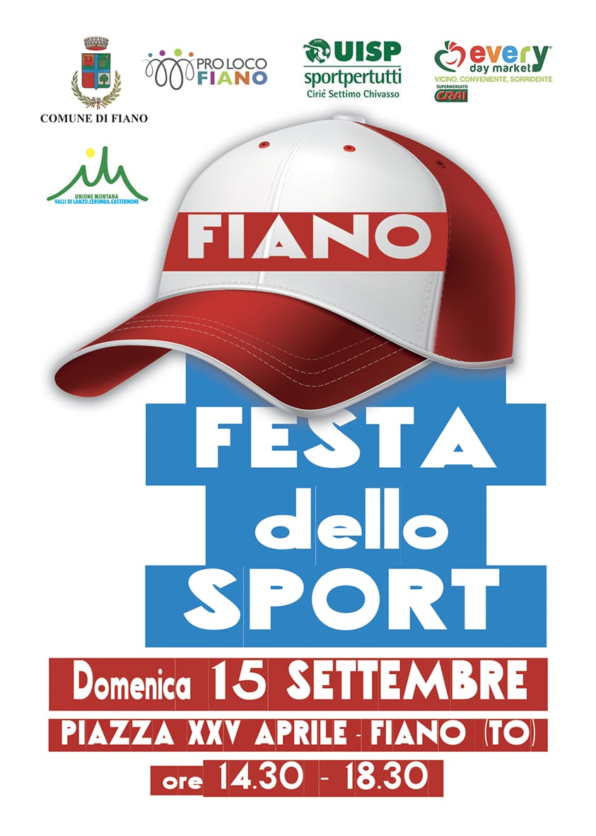 Domenica 15 Settembre, al pomeriggio, dalle 14.30 alle 18.30, si terrà a Fiano la 'Festa dello Sport'.