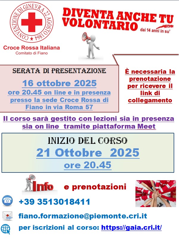 Info e prenotazioni: Tel. 3513018411 - mail fiano.formazione@piemonte.cri.it