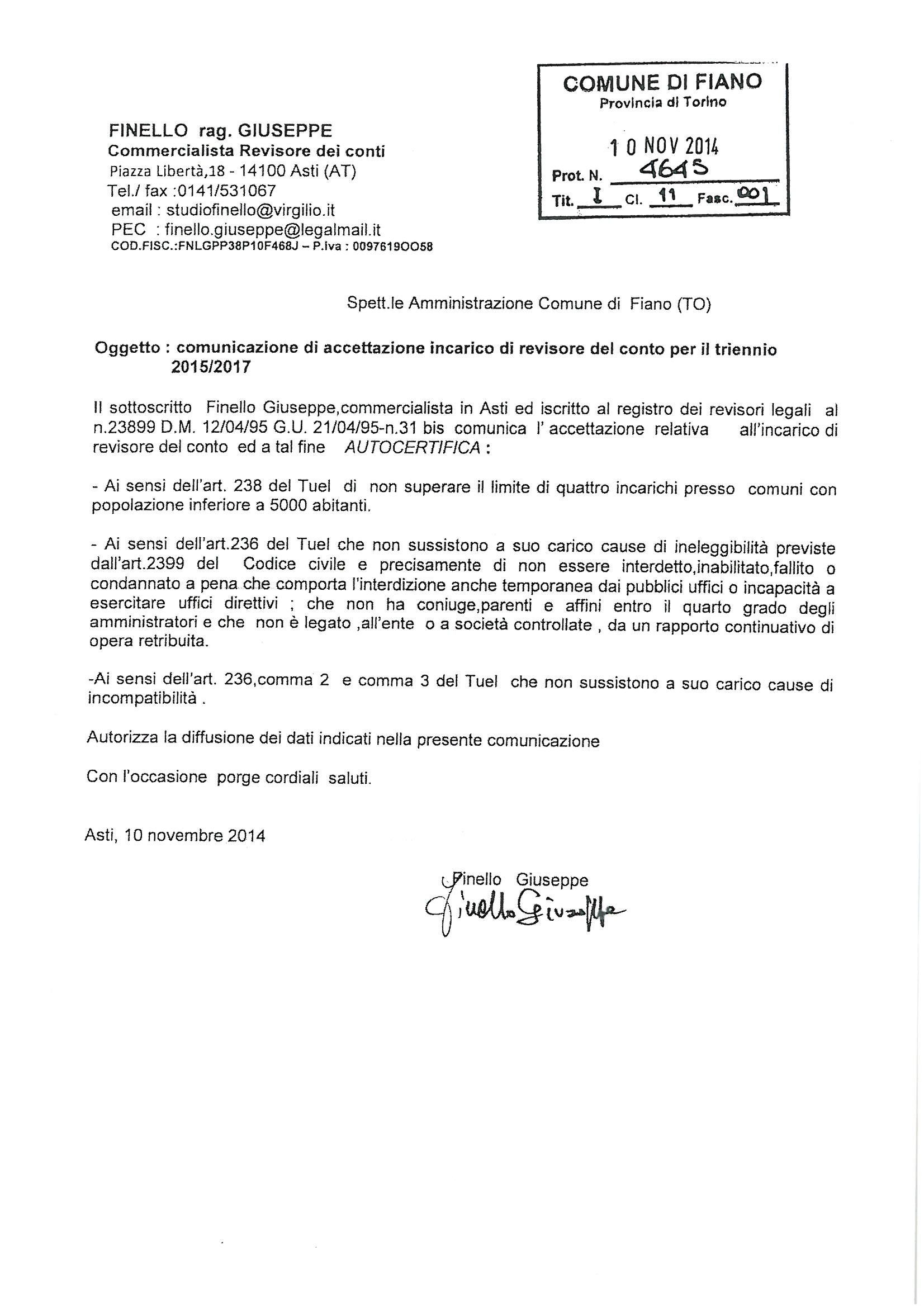 Accettazione incarico di Revisore del Conto per il triennio 2015/2017
