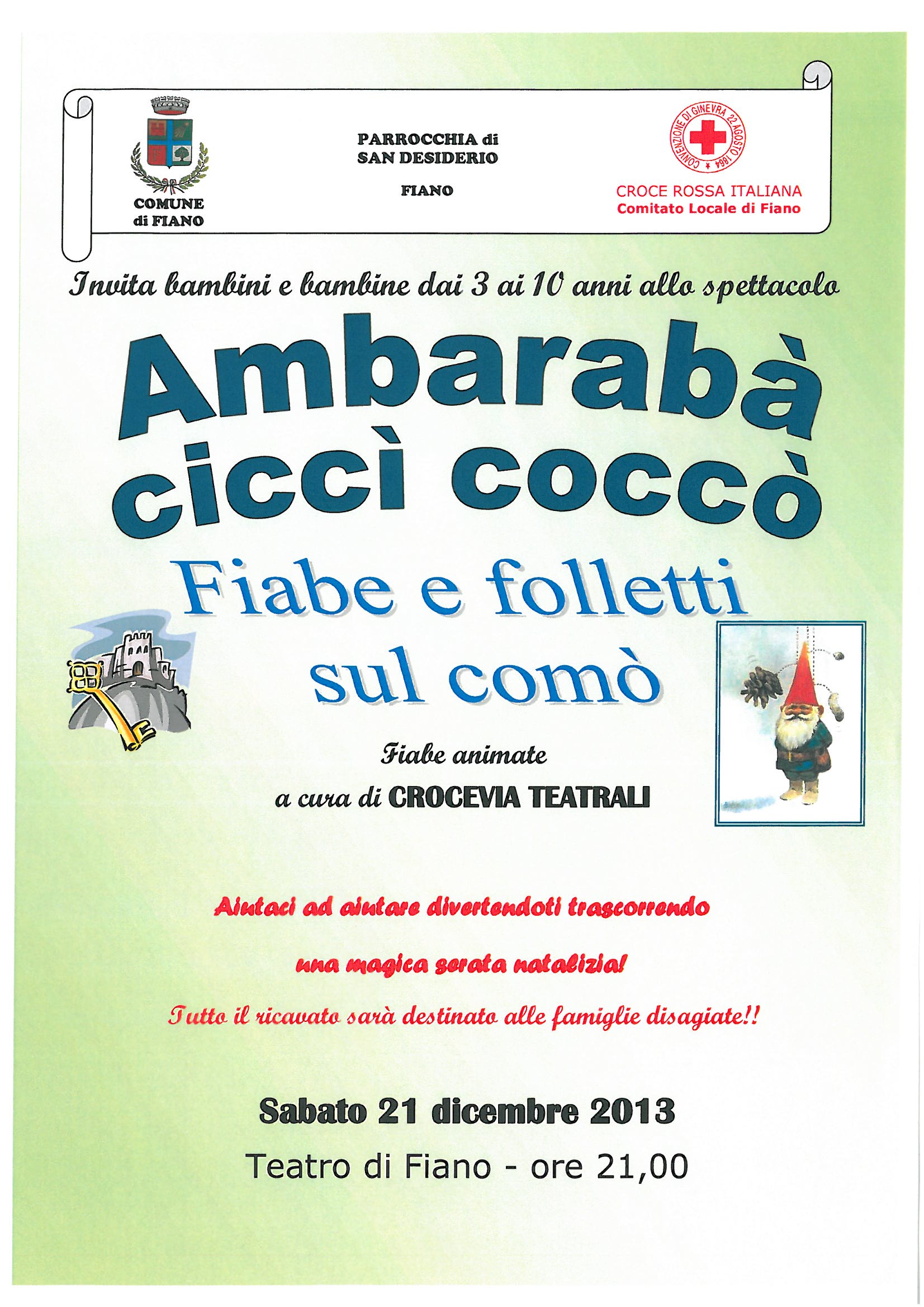 Sabato 21 dicembre 2013 dalle ore 21,00 presso il salone del Teatro della Scuola Materna si terrà lo spettacolo di fiabe animate "Ambarabà ciccì coccò" .