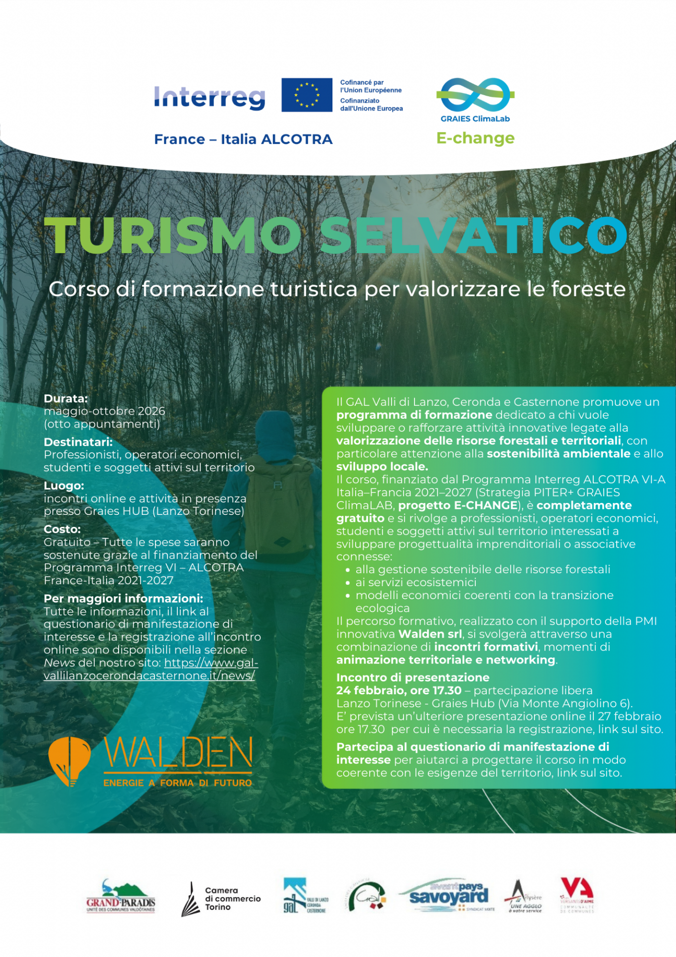 Il GAL Valli di Lanzo, Ceronda e Casternone promuove un programma di formazione finalizzato a supportare la nascita e il consolidamento di attività innovative legate alla valorizzazione delle risorse forestali e territoriali, con particolare attenzione alla sostenibilità ambientale e allo sviluppo locale.